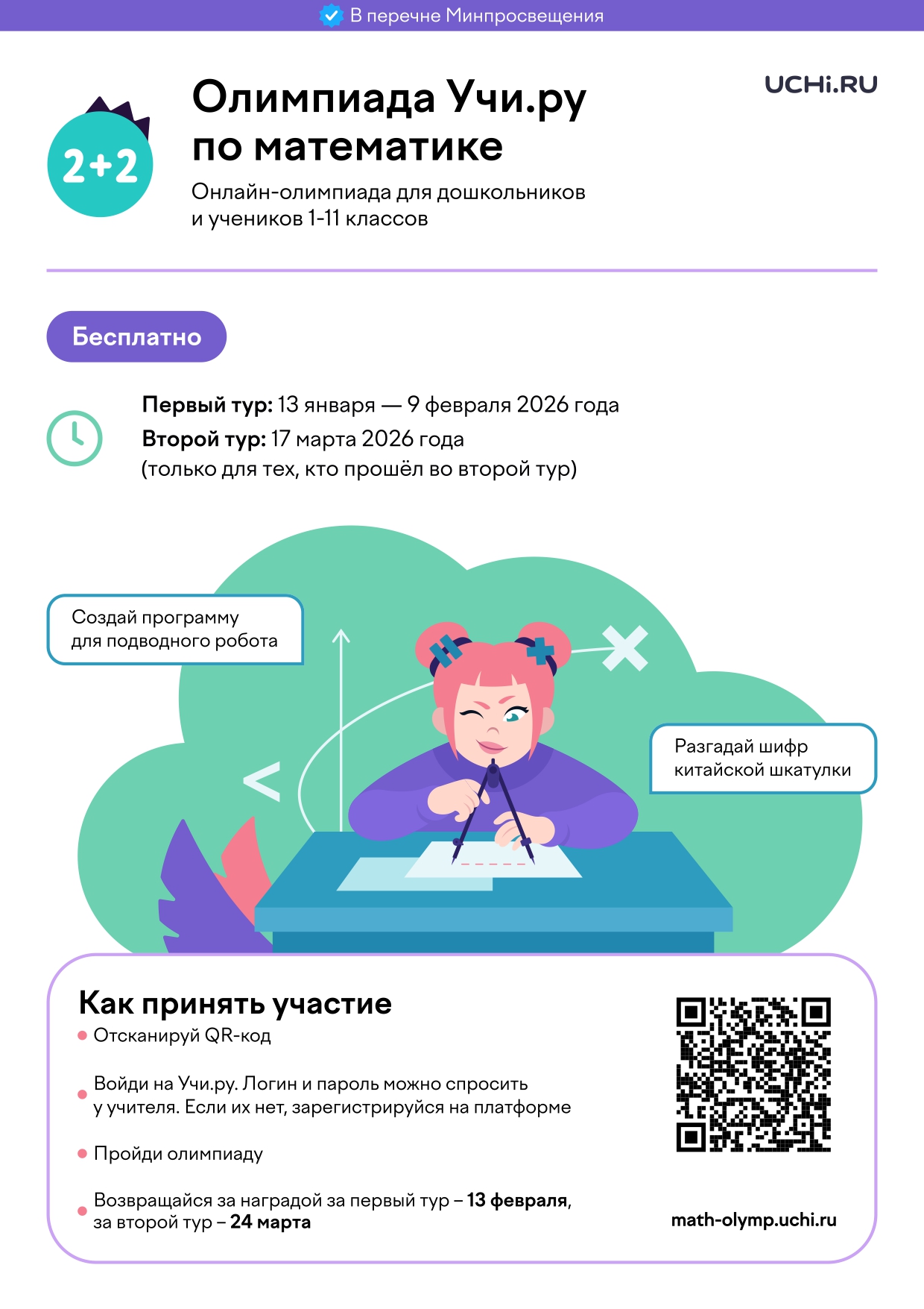 Цифры говорят сами за себя: 100% наших участников успешно завершили первый тур онлайн-олимпиады по математике на платформе Учи.ру! Ребята не просто решили задачи, а прошли увлекательный игровой маршрут, развивая логику и нестандартное ...